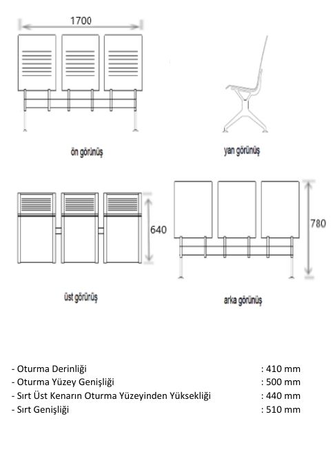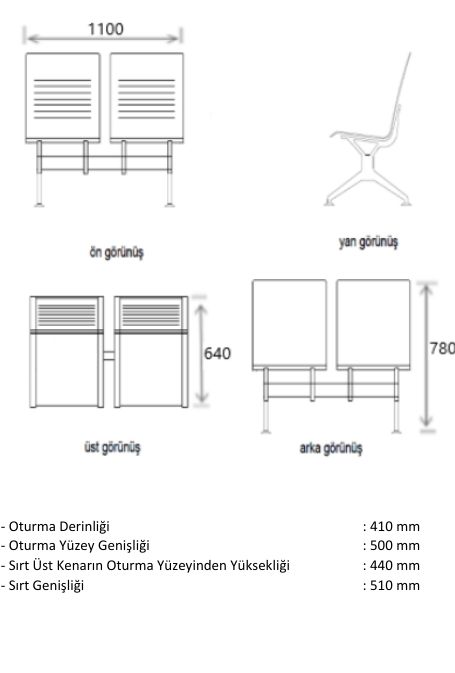 | 550 | Üçlü Kollu Tam Döşemeli | Bekleme Koltuğu | 0,16 m³ | |